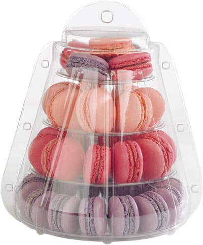 With removable plastic floors. This round tower with a plastic dome is perfect for presenting the delicious macarons.