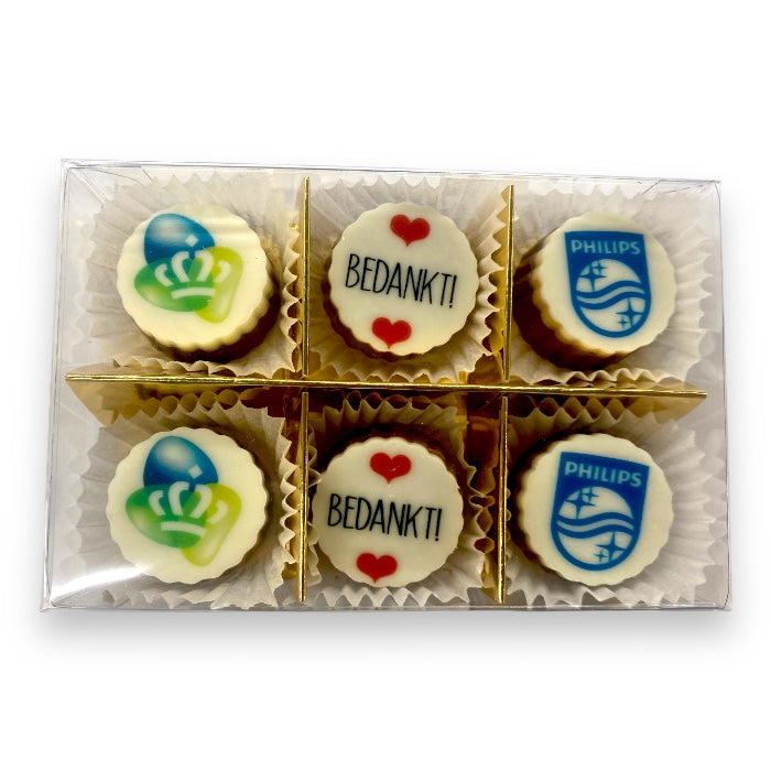 6 heerlijke ambachtelijke bonbons met logo. We hebben deze helemaal vernieuwd en u kunt nu kiezen in de vulling die u wilt. Zit de smaak er niet bij die u wilt, laat het ons even weten en misschien kunnen wij dit voor u regelen. Wij leveren 1 smaak vulling per bestelling.