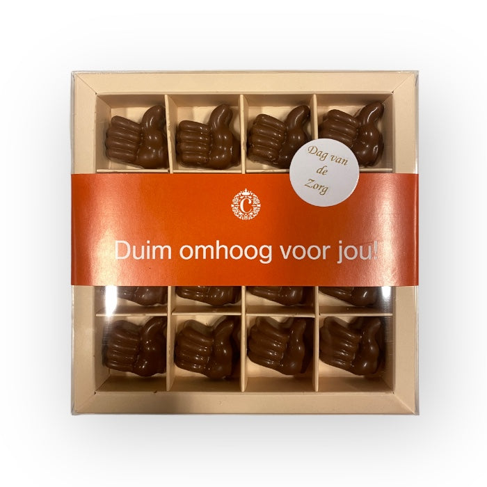 Speciaal voor de Dag van de Zorg. Heerlijke chocoladeduimpjes gemaakt van de lekkerste Belgische melkchocolade. 16 stuks in een box. Met een wikkel om de doos met de tekst: Duim omhoog voor jou!